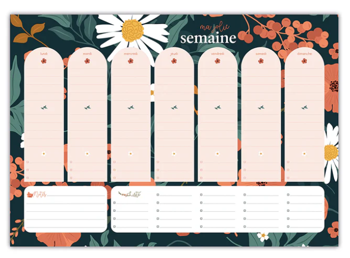 Découvrez ce joli semainier, conçu pour une gestion facile de votre semaine. Il présente de jolies illustrations fleuries et offre une colonne par jour pour vos rendez-vous, votre emploi du temps et le menu de la semaine.